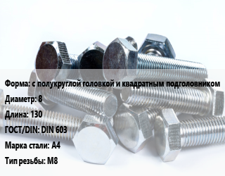 Болт с полукруглой головкой и квадратным подголовником 8х130 DIN 603 Сталь: А4 М8, цену уточнять, кг цена от 15.3 ₽ / кг, где купить, условия доставки в Саратове и Саратовской области