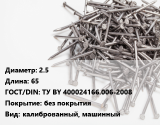 Гвоздь 2.5х65 ГОСТ: ТУ BY 400024166.006-2008 без покрытия калиброванный, машинный