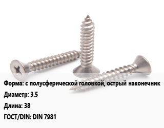 Саморез с полусферической головкой, острый наконечник D=3.5 L=38 ГОСТ: DIN 7981
