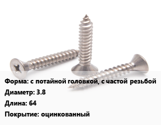 Саморез с потайной головкой, с частой резьбой D=3.8 L=64 оцинкованный