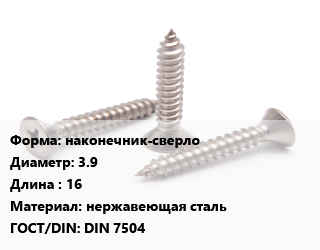 Саморез наконечник-сверло D=3.9 L=16 нержавеющая сталь ГОСТ: DIN 7504, шт цена По запросу где купить, условия доставки в Саратове и Саратовской области