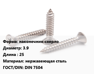 Саморез наконечник-сверло D=3.9 L=25 нержавеющая сталь ГОСТ: DIN 7504, упаковка 8000 шт цена от 5 053 ₽ / кг, где купить, условия доставки в Саратове и Саратовской области