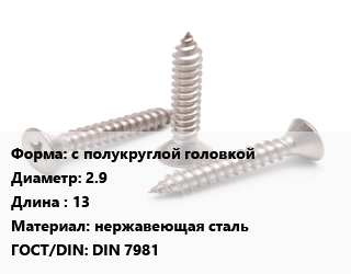 Саморез с полукруглой головкой D=2.9 L=13 нержавеющая сталь ГОСТ: DIN 7981