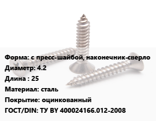 Саморез с пресс-шайбой, наконечник-сверло D=4.2 L=25 сталь оцинкованный ГОСТ: ТУ BY 400024166.012-2008