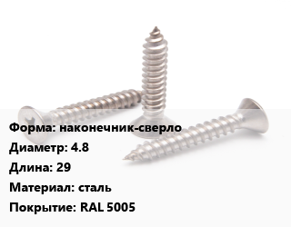 Саморез наконечник-сверло D=4.8 L=29 сталь RAL 5005, упаковка 1000 шт цена от 1 881 ₽ / кг, где купить, условия доставки в Саратове и Саратовской области