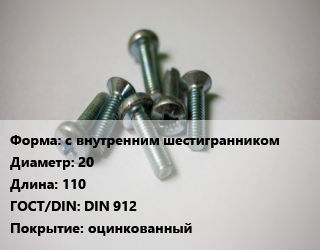Винт с внутренним шестигранником 20х110 DIN 912 оцинкованный, 8.8, Китай,цена за шт, кг цена от 255.15 ₽ / кг, где купить, условия доставки в Саратове и Саратовской области