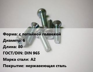 Винт с потайной головкой 6х80 DIN 965 Сталь: А2 нержавеющая сталь, цена за шт, кг цена от 47.7 ₽ / кг, где купить, условия доставки в Саратове и Саратовской области