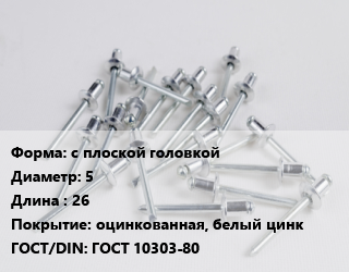Заклепка с плоской головкой 5х26 оцинкованная, белый цинк ГОСТ: ГОСТ 10303-80