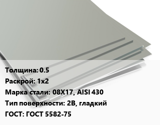 Лист нержавеющий 0.5 1х2 Сталь: 08Х17, AISI 430 Тип:2B, гладкий ГОСТ 5582-75