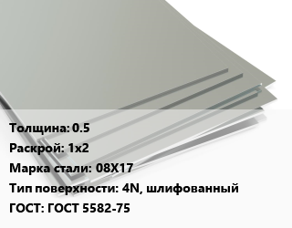 Лист нержавеющий 0.5 1х2 Сталь: 08Х17 Тип:4N, шлифованный ГОСТ 5582-75