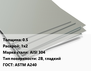 Лист нержавеющий 0.5 1х2 Сталь: AISI 304 Тип:2B, гладкий ASTM A240