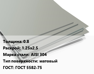 Лист нержавеющий 0.8 1.25х2.5 Сталь: AISI 304 Тип:матовый ГОСТ 5582-75