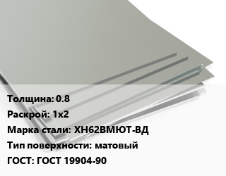 Лист нержавеющий 0.8 1х2 Сталь: ХН62ВМЮТ-ВД Тип:матовый ГОСТ 19904-90