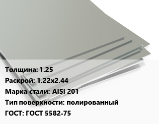 Лист нержавеющий 1.25 1.22х2.44 Сталь: AISI 201 Тип:полированный ГОСТ 5582-75
