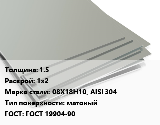 Лист нержавеющий 1.5 1х2 Сталь: 08Х18Н10, AISI 304 Тип:матовый ГОСТ 19904-90