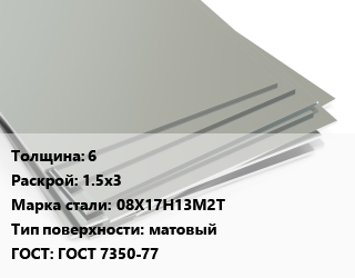 Лист нержавеющий 6 1.5х3 Сталь: 08Х17Н13М2Т Тип:матовый ГОСТ 7350-77
